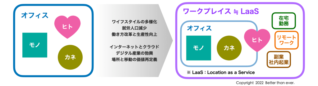 インターネットテクノロジーとクラウドで結ばれた『場所(Location)』の自由選択と有効活用によって実現するLaaS(価値を生み出す場の活用)の発展と啓蒙を通じて、企業とワーカーだけでなく地方創生や地域活性を支援いたします。
